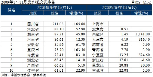 投資前10的省(區(qū)、市)主要來自中南、西南地區(qū),政府西部開發(fā)的傾向與經(jīng)濟發(fā)展的偏移,也是西部水泥高投資的原因。其中四川地區(qū)受災后重建拉動,水泥投資額與水泥投資增速均高居全國第一,投資額為211.03億元,同比增長165.6%。