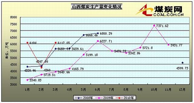 3月份,全國主要煤炭產(chǎn)區(qū)原煤產(chǎn)量均呈較快增長勢頭,增幅多在兩位數(shù)。統(tǒng)計數(shù)據(jù)顯示,3月份,山西、內(nèi)蒙、陜西原煤產(chǎn)量依次位列全國前三,分別完成原煤產(chǎn)量6112萬噸、6064萬噸、2712萬噸,分別同比增長60.76%、26.24%以及18.98%。3月份,以上三省原煤產(chǎn)量占全國比重達到53.2%,與1、2月份相比,分別提高0.7和0.2個百分點,煤炭生產(chǎn)的區(qū)域集中度持續(xù)提高,山西任然居于首位。比二月原煤生產(chǎn)多1852.5萬噸