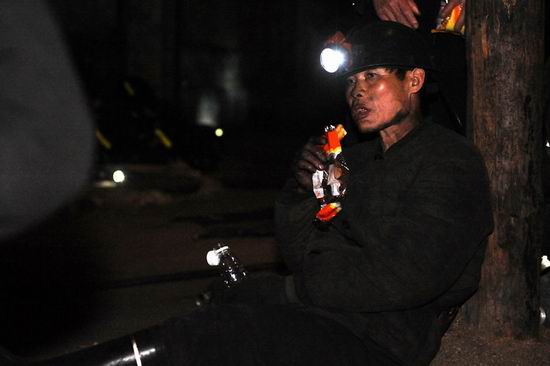 5月19日凌晨,一名礦工在井口附近吃食物補(bǔ)充體力,隨時準(zhǔn)備下井救人。