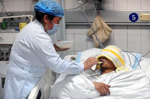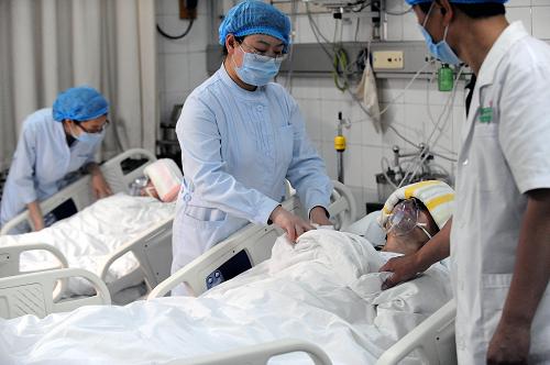 6月7日,在晉煤集團(tuán)總醫(yī)院重癥監(jiān)護(hù)室內(nèi),醫(yī)護(hù)人員在看護(hù)獲救礦工。