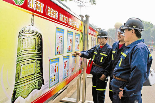 6月13日,陽煤五礦舉行了安全生產(chǎn)宣傳咨詢?nèi)栈顒樱栒俾毠淖陨碜銎,學(xué)習(xí)安全知識,提高安全意識,進(jìn)行安全生產(chǎn)。圖為礦工正在觀看安全生產(chǎn)宣傳板面。