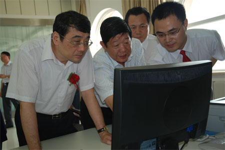 7月15日,在榆樹井煤礦調度室,國家煙草專賣局副局長李克明,臨礦集團董事長、黨委書記李義文,中國雙維投資公司總經(jīng)理吳建明(自左至右)在監(jiān)視屏前觀察煤炭生產運行情況。