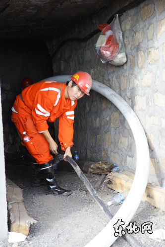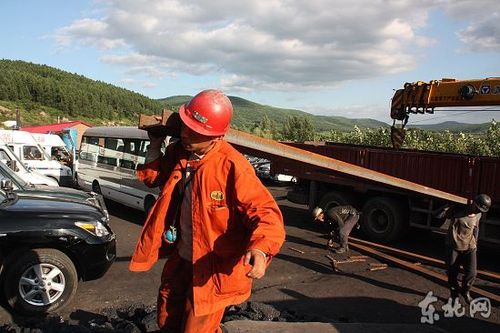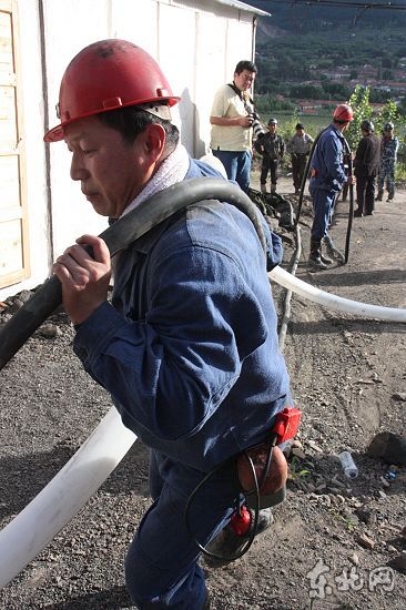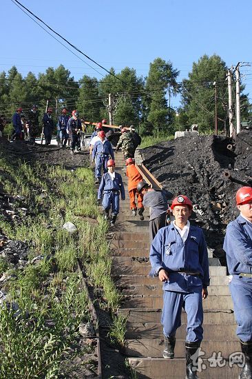 工作人員用肩膀扛著鋼架走上臺階,陸續(xù)有礦工下來支援。