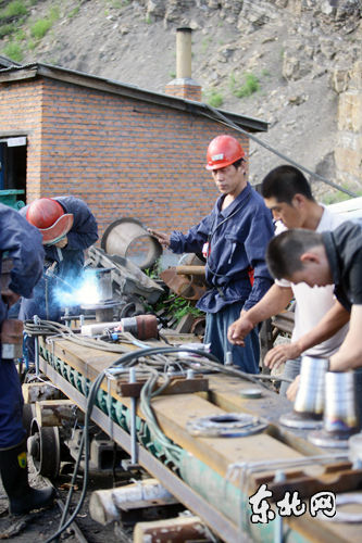 現(xiàn)場工作人員冒著酷熱趕制零件。
