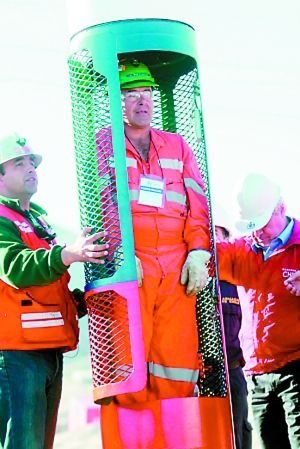 智利礦難中,礦工乘“鳳凰號”救生艙升井。