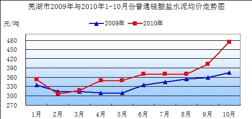 從上面的水泥的零售價格統(tǒng)計表和走勢圖,可以清晰的看到,十月份蕪湖市水泥的零售價格出現(xiàn)較大幅度的上漲,其中當前市場上銷售的普通硅酸鹽水泥(袋裝)32.5強度和42.5強度的價格分別為445元/噸和505元/噸。與上月相比,環(huán)比漲幅為21.92%和18.82%,同比則分別出現(xiàn)了27.14%和26.25%的漲幅。