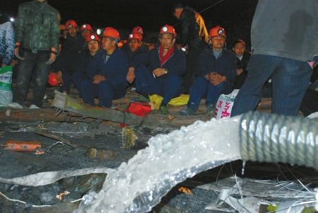 截至昨晚10時30分許,有關(guān)部門已調(diào)集10余臺抽水機24小時不間斷抽水,其中包括一根排水量較大的250毫米主抽水管,估計每小時抽水總量可達(dá)300至400立方米,“按照現(xiàn)在的抽水速度,最快要36至48小時能把積水排空,鑒于礦井內(nèi)積水已不再上漲,估計礦井內(nèi)被困人員生還的希望還是比較大的!睋岆U救援指揮部人員分析。