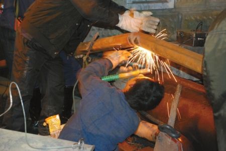 晚上7:55,由于積水過多,礦井水位并沒有發(fā)生明顯變化。事故現(xiàn)場礦井井口的工人正在焊接新的抽水鋼管,以擴大抽水作業(yè)進(jìn)度。