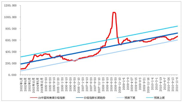 圖2 CR中國焦炭價格指數(shù)歷史趨勢及預(yù)測范圍