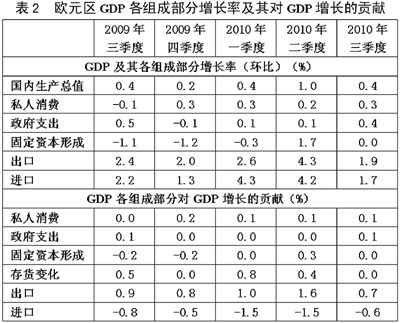 發(fā)達(dá)經(jīng)濟(jì)體被迫改變負(fù)債消費(fèi)模式。長期以來,以美國為首的發(fā)達(dá)國家主要靠消費(fèi)來拉動經(jīng)濟(jì)增長。其中,美國個(gè)人消費(fèi)支出占經(jīng)濟(jì)總量的2/3以上。今后這種基本格局雖然不會改變,但以住房次級按揭貸款形式為標(biāo)志的負(fù)債消費(fèi)和過度消費(fèi)模式已經(jīng)難以為繼。美國消費(fèi)信貸2010年連續(xù)7個(gè)月放緩,美國民眾的消費(fèi)習(xí)慣有所改變,傾向于更為謹(jǐn)慎。在歐元區(qū),長期居高不下的失業(yè)率和人口老齡化加劇了居民消費(fèi)的低迷。而且,歐元區(qū)各國為了遏制主權(quán)債務(wù)危機(jī)所采取的財(cái)政緊縮政策,如增加稅收、減少補(bǔ)貼等,又對居民消費(fèi)產(chǎn)生明顯的抑制作用。在日本,2010年前三季度的數(shù)據(jù)表明,民間最終消費(fèi)的增長速度低于民間企業(yè)投資和貨物勞務(wù)出口的增長速度,居民消費(fèi)仍然疲軟。在消費(fèi)不振的情況下,發(fā)達(dá)經(jīng)濟(jì)體的緩慢復(fù)蘇更多得益于投資與出口。美國采取量化寬松的貨幣政策,促使美元貶值,加上奧巴馬政府提出的“再工業(yè)化”和“出口倍增計(jì)劃”,一定程度上刺激了經(jīng)濟(jì)恢復(fù)并弱化了經(jīng)濟(jì)增長對消費(fèi)拉動的依賴。從表1可以看出,2010年前三季度,美國個(gè)人消費(fèi)的增長速度都低于私人國內(nèi)投資和出口。從表2可以看出,2010年上半年特別是二季度,歐元區(qū)經(jīng)濟(jì)加速復(fù)蘇主要得益于出口的迅速恢復(fù)。日本的情況也是如此。