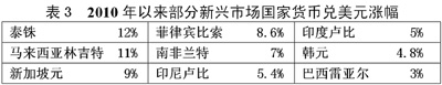 美國量化寬松貨幣政策導(dǎo)致美元貶值,人民幣升值壓力增大。從2010年8月以來,美國已經(jīng)啟動兩輪量化寬松貨幣政策,并開始醞釀2011年的寬松貨幣政策。這導(dǎo)致美元對日元等西方貨幣一路下跌,并使許多發(fā)展中國家貨幣對美元大幅度升值(見表3)。2010年以來,人民幣對美元匯率升值幅度已接近3%。人民幣匯率上升,使我國出口貿(mào)易企業(yè)經(jīng)營困難,貿(mào)易順差呈下降趨勢。在這種情況下,堅(jiān)持?jǐn)U大內(nèi)需更具有現(xiàn)實(shí)意義。