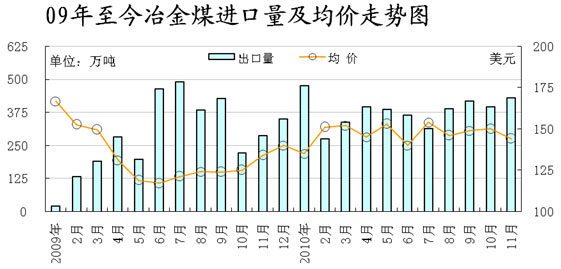 從海關(guān)數(shù)據(jù)獲悉:(如下圖所示)中國冶金煤數(shù)量呈波動性上漲態(tài)勢。2008年中國冶金煤進(jìn)口數(shù)量僅為685萬噸;隨著金融危機(jī)來臨,2009年中國冶金煤累計(jì)進(jìn)口數(shù)量達(dá)到3448萬噸,增幅達(dá)到5倍;2010年我國冶金煤預(yù)測數(shù)據(jù)將達(dá)到4500萬噸?梢娢覈苯鹈哼M(jìn)口市場呈現(xiàn)價格上揚(yáng)、數(shù)量猛增的趨勢。
