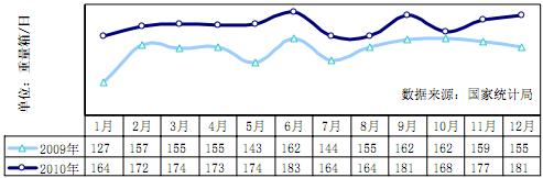 水泥產(chǎn)量高位回落。據(jù)統(tǒng)計 2010 年12 月水泥產(chǎn)量 16996.2 萬噸,同比增長 16.4%,日均產(chǎn)量環(huán)比下降 6.85%,2010 年全年累計水泥產(chǎn)量 18.68 億噸,同比增長 15.5%。