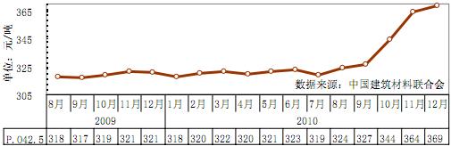 進(jìn)入 2010 年 12 月,水泥價格繼續(xù)上漲,漲幅趨緩。據(jù)統(tǒng)計,12 月重點(diǎn)聯(lián)系水泥企業(yè)42.5 級普通硅酸鹽水泥平均價格為 368.9 元/噸,環(huán)比增長 1.3%,比年初上漲 16.1%,同比增長 15.0%。