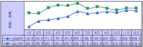 2010 年全年累計(jì),生鐵、粗鋼和鋼材產(chǎn)量分別為 5.90 億噸、6.27 億噸和 7.96 億噸,同比分別增長(zhǎng) 7.4%、9.3%和 14.7%,增幅分別比 2009 年回落 8.5 個(gè)百分點(diǎn)、4.2 個(gè)百分點(diǎn)和3.8 個(gè)百分點(diǎn)。
