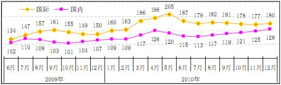 圖 6 2009-2010 年國(guó)內(nèi)外鋼材市場(chǎng)鋼材綜合價(jià)格指數(shù)