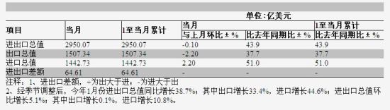 由于受春節(jié)長(zhǎng)假的影響,節(jié)前集中進(jìn)出口的現(xiàn)象比較突出,繼而推動(dòng)今年1月份我國(guó)外貿(mào)的快速增長(zhǎng)。今年1月份我國(guó)外貿(mào)同比進(jìn)出口增幅高達(dá)43.9%;但較去年12月份仍有0.1%的微幅下降,其中出口環(huán)比下降2.2%,進(jìn)口環(huán)比增長(zhǎng)2.2%。