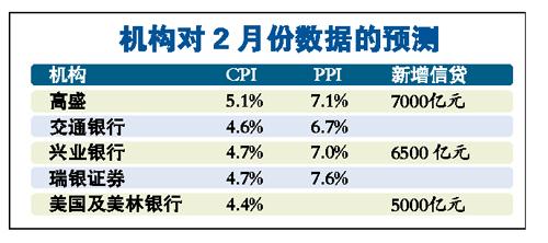 目前市場估計2月份CPI的漲幅大都在3.9%~4.4%之間波動。美國及美林銀行中國經(jīng)濟(jì)學(xué)家陸挺認(rèn)為2月份的CPI漲幅很可能達(dá)到4.4%,但是3月份的CPI漲幅則會反彈到5%左右,CPI的上漲很大一部分原因是由于勞動力成本的上升,因此政策不會收緊至抑制經(jīng)濟(jì)的增長。