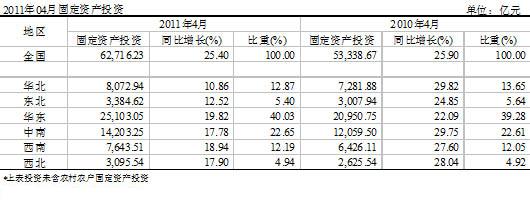 2011年1~4月份,固定資產(chǎn)投資仍保持平穩(wěn)較快的增長,累計完成投資62,716億元,同比增速為25.4%,去年同期的同比增速降低0.5個百分點。