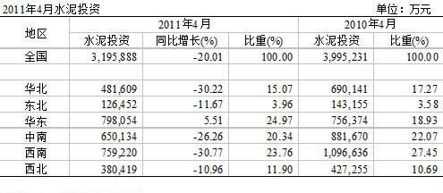 在國家對新建產(chǎn)能的嚴卡下,水泥投資增長繼續(xù)回落,2011年4月份全國水泥累計投資319億元,同比負增長20%。