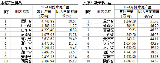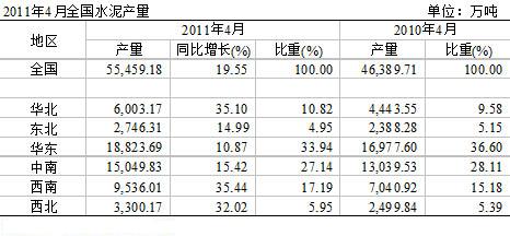 2011年4月份水泥產(chǎn)量5.5億噸,同比增速19.55%。遠超預期,從各大區(qū)來看,西南,華北、西北增長均超過30%,其余地區(qū)也超過2位數(shù)增長,說明1~4月份的水泥市場形式依舊保持旺盛。