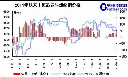 2011年以來(lái)上海熱卷與螺紋鋼價(jià)格