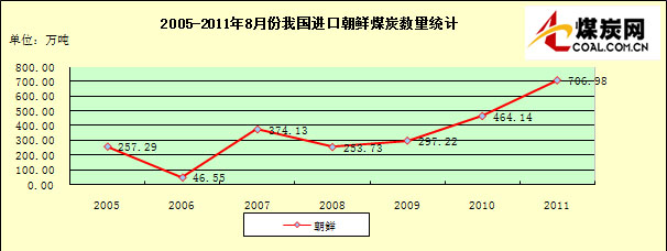 2005-2011年8月份我國進口朝鮮煤炭數(shù)量走勢統(tǒng)計
