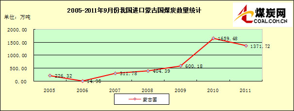 2005-2011年9月份我國進口蒙古煤炭數(shù)量走勢統(tǒng)計