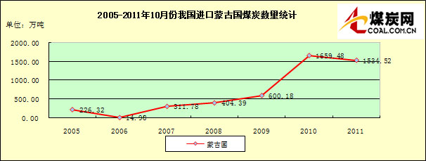 2005-2011年10月份我國進口蒙古國煤炭數(shù)量走勢統(tǒng)計