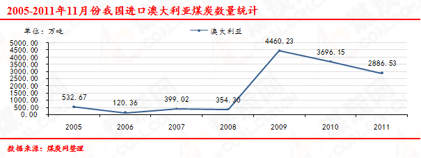 2005-2011年11月份我國(guó)進(jìn)口澳大利亞煤炭數(shù)量走勢(shì)統(tǒng)計(jì)