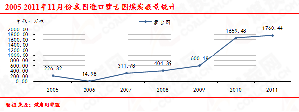 2005-2011年11月份我國進口蒙古國煤炭數(shù)量走勢統(tǒng)計