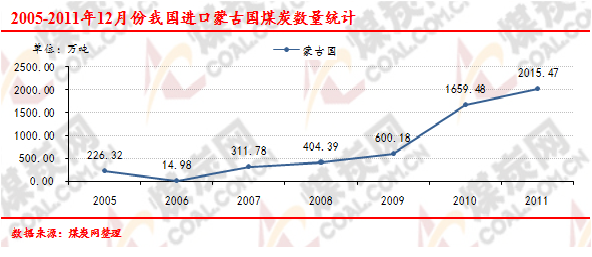 2005-2011年12月份我國進(jìn)口蒙古國煤炭數(shù)量走勢統(tǒng)計