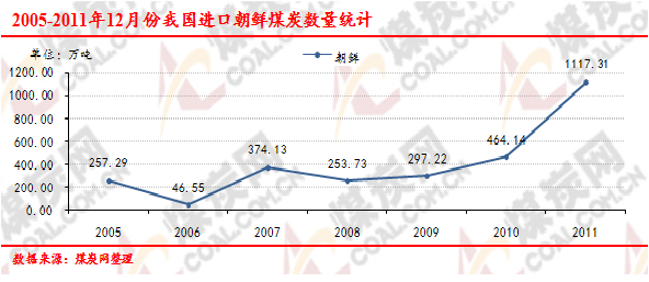2005-2011年12月份我國(guó)進(jìn)口朝鮮煤炭數(shù)量走勢(shì)統(tǒng)計(jì)