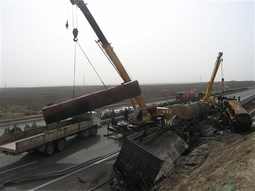 隨后,中隊官兵利用車載泡沫撲滅明火,同時對車輛實施冷卻控制。此時罐車油箱已經(jīng)燒毀,隨后,消防官兵對起火的拉煤車進行撲救,與交警組織群眾轉(zhuǎn)移煤以防火勢蔓延。于10時32分成功撲滅火災(zāi)。此次事故中,后一輛拉煤車駕駛室完全燒毀,死亡一人。