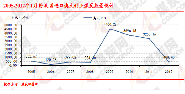 2005-2012年1月份我國(guó)進(jìn)口澳大利亞煤炭數(shù)量走勢(shì)統(tǒng)計(jì)