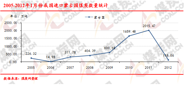 2005-2012年1月份我國進(jìn)口蒙古國煤炭數(shù)量走勢統(tǒng)計