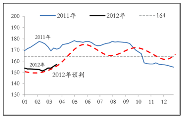2012年1季度的鋼價(jià)走勢(shì)與預(yù)判相一致,我們對(duì)全年的預(yù)判仍維持不變。前期報(bào)告中,我們認(rèn)為,鋼價(jià)在2011年底至2012年1季度這段時(shí)期將呈現(xiàn)“先探底,后回升”的格局,回升開(kāi)始的時(shí)間點(diǎn)在2月底3月初,而國(guó)內(nèi)鋼材市場(chǎng)實(shí)際走勢(shì)大體與此相一致。對(duì)于今年全年鋼價(jià)運(yùn)行預(yù)判,我們認(rèn)為,將是一個(gè)緩慢回升的過(guò)程,其間可能有反復(fù),但總體上將呈現(xiàn)“前低后高”的走勢(shì)。