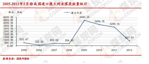 2005-2012年2月份我國進口澳大利亞煤炭數(shù)量走勢統(tǒng)計