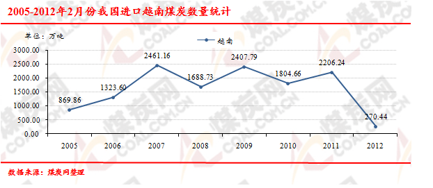 2005-2012年2月份我國(guó)進(jìn)口越南煤炭數(shù)量走勢(shì)統(tǒng)計(jì)
