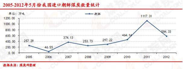 2005-2012年5月份我國進口朝鮮煤炭數(shù)量走勢統(tǒng)計