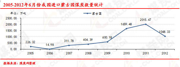 2005-2012年6月份我國進(jìn)口蒙古國煤炭數(shù)量走勢統(tǒng)計(jì)