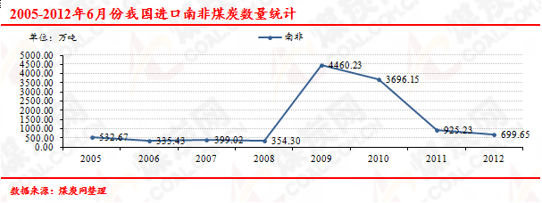 2005-2012年6月份我國進(jìn)口南非煤炭數(shù)量走勢統(tǒng)計