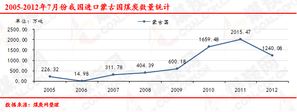 2005-2012年7月份我國(guó)進(jìn)口蒙古煤炭數(shù)量走勢(shì)統(tǒng)計(jì)