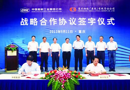 9月11日下午,中國船舶工業(yè)集團(tuán)公司(下稱“中船集團(tuán)”)、重鋼集團(tuán)在重慶索菲特酒店共同簽署《戰(zhàn)略合作協(xié)議》、《加強非船(非鋼)領(lǐng)域合作框架協(xié)議》、《鋼板、焦煤、鐵礦砂供銷協(xié)議》。