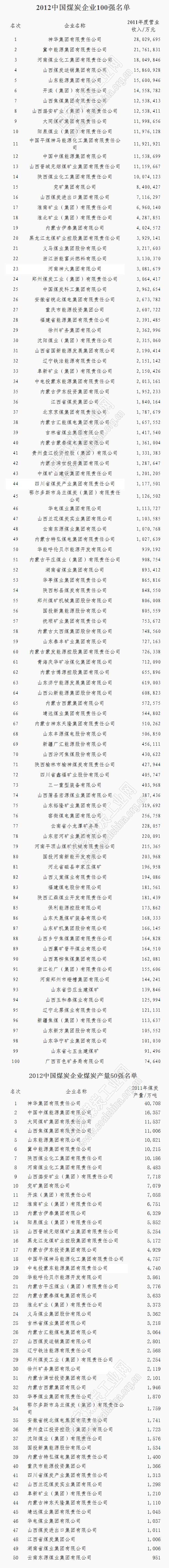 中國煤炭工業(yè)協(xié)會分別向社會發(fā)布了2012中國煤炭企業(yè)100強和2012中國煤炭企業(yè)煤炭產(chǎn)量50強名單。