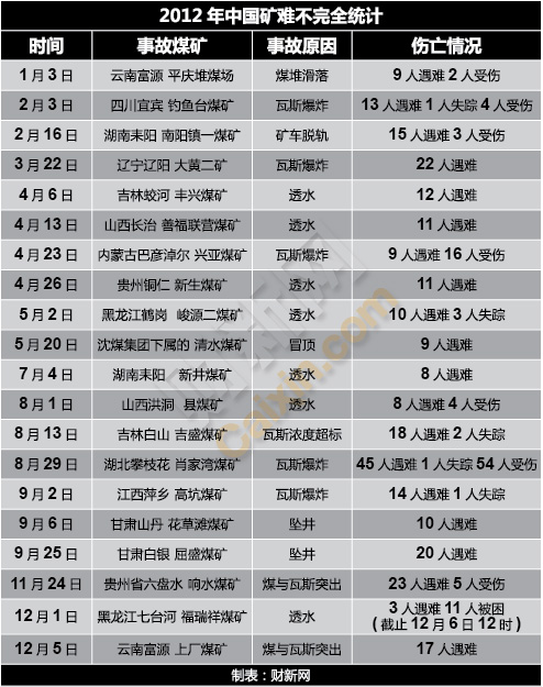 回顧過去的11個月,“礦難”依然是貫穿2012年的高頻字眼。1月3日,同樣是在云南富源,一起礦難事故奪去9名礦工的生命。財新網整理了今年發(fā)生的導致傷亡人數較多的礦難事故如下: