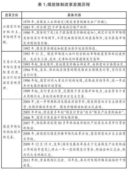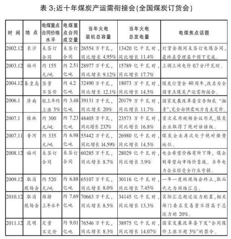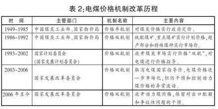 我國煤炭體制改革發(fā)展歷程大概經(jīng)歷了三個(gè)階段:1949~1992年,以國家計(jì)劃分配為主,市場調(diào)節(jié)為輔;1993~2002年,計(jì)劃分配向市場配置資源過渡,運(yùn)力計(jì)劃由國家宏觀管理;2002年至今,煤炭市場化體制機(jī)制不斷完善。(詳見表1)我國電煤價(jià)格機(jī)制改革歷程和煤炭體制改革發(fā)展大體同步,細(xì)分開來,經(jīng)歷了五個(gè)階段:1949~1985年,由國家制定煤炭價(jià)格,實(shí)行價(jià)格單軌制,這一時(shí)期的煤炭價(jià)格既不反映價(jià)值,也不反映供求關(guān)系;1986~1992年,國家控制大部分煤炭價(jià)格,實(shí)行價(jià)格雙軌制,全國統(tǒng)配煤礦、重點(diǎn)煤礦的煤炭,實(shí)行統(tǒng)一的計(jì)劃價(jià)格,超產(chǎn)部分實(shí)施加價(jià),特殊煤種實(shí)行市場價(jià);1993~2002年,煤炭價(jià)格向市場化過渡,隨著煤炭產(chǎn)量大幅增加,特別是市場化改革進(jìn)程加快,國家逐漸放開了除發(fā)電用煤以外的煤炭價(jià)格;2003~2006年,國家取消對電煤的國家指導(dǎo)價(jià),煤炭產(chǎn)品的價(jià)格主要由市場供需關(guān)系決定,但由于多重因素影響,電煤價(jià)格雙軌制以及電煤由政府指導(dǎo)定價(jià)的現(xiàn)實(shí)仍然沒有根本性改變;2006年至今,國家決定全部放開電煤價(jià)格后,但重點(diǎn)合同電煤價(jià)格與市場煤價(jià)格的差距仍非常大。(詳見表2)全國煤炭訂貨會(huì) (又稱全國煤炭產(chǎn)運(yùn)需銜接會(huì)、匯總會(huì))作為我國煤炭產(chǎn)運(yùn)需銜接配置的主要實(shí)現(xiàn)形式,已有50多年的歷史,會(huì)議的形式在不斷調(diào)整,內(nèi)容也在不斷變化,但“煤電頂!币恢笔墙裹c(diǎn)話題,尤其是2002年之后,矛盾更加突出。