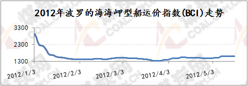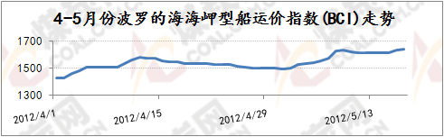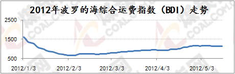 波羅的海海岬型指數(shù)BCI主要反映煤炭與鐵礦石的貿(mào)易狀況,2011年年底,隨著煤炭和鐵礦石等大宗散貨運(yùn)輸冬儲(chǔ)的完成,海運(yùn)市場(chǎng)日趨冷清,BCI跌勢(shì)相較BDI更猛,2012年年初下行至2955點(diǎn),比2011年12月份高點(diǎn)下跌700點(diǎn),下跌幅度達(dá)到20.7%,2012年1月末再度急劇下行1508點(diǎn)至1447點(diǎn),此后至今波羅的海海峽型船運(yùn)價(jià)指數(shù)BCI一直在低位維持低迷震蕩的局勢(shì),反彈無(wú)力。國(guó)際海運(yùn)費(fèi)持續(xù)低迷震蕩的原因如上所述根本上受世界經(jīng)濟(jì)不景氣影響大宗商品交易量下降,國(guó)際煤炭、鐵礦石總體需求持續(xù)低位尤其是中國(guó)方面的煤炭、鐵礦石需求相對(duì)低位,4月份中國(guó)鐵礦石進(jìn)口量連續(xù)2個(gè)月回落,鐵礦石價(jià)格也隨著鋼材價(jià)格的不斷下挫而持續(xù)陰跌,很大程度上影響了國(guó)際航運(yùn)市場(chǎng),而國(guó)際航運(yùn)市場(chǎng)也因?yàn)榇笞谏唐焚Q(mào)易量的下降而呈現(xiàn)“運(yùn)力過(guò)!钡臓顩r,后期即使到了5月份國(guó)際海運(yùn)費(fèi)也難有反彈動(dòng)力,維持低位漲跌震蕩為主。