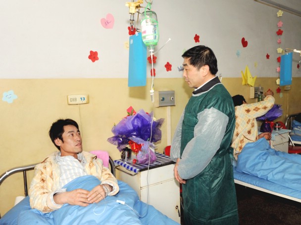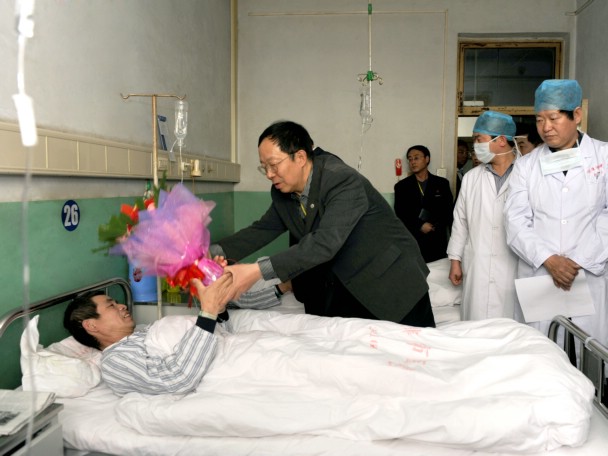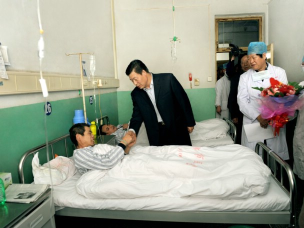 在河津市人民醫(yī)院和山西鋁廠醫(yī)院,王安、曹祖民、王晞一行到病房看望了18名獲救礦工,并向獲救礦工獻上鮮花。在河津市人民醫(yī)院,王安拉著獲救礦工、綜采二隊隊長王紀明的手說,在搶險救援的八天八夜里,參與搶險救援的各界人員達7000余人,鋪設管道27.5公里,井上的救援人員與時間爭生命,你們在井下團結自救,打通巷道,使更多的礦工獲得營救,這種精神值得敬佩。王安囑咐獲救礦工好好休息,并祝他們早日康復。