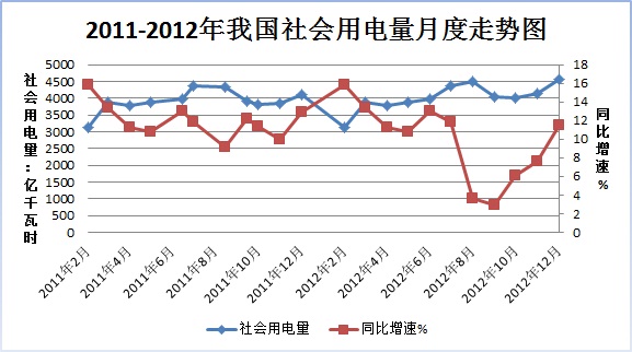 1.電量增長先抑后揚(yáng),總體回落明顯。主要呈現(xiàn)出四個特征:一是電量增速明顯回落。根據(jù)國家能源局統(tǒng)計(jì),2012年全社會用電量累計(jì)達(dá)49591億千瓦時,同比增長5.5%,增速較上年回落6.5個百分點(diǎn),自2010年以來首次出現(xiàn)低于GDP增速。用電占比達(dá)到73.7%的第二產(chǎn)業(yè)用電量同比增長3.9%,對全社會用電增長的貢獻(xiàn)率僅為51%;而第三產(chǎn)業(yè)和居民用電增速分別達(dá)到11.5%和10.7%,對全社會用電增長的貢獻(xiàn)率合計(jì)達(dá)到49%。二是電力供需平衡寬松。由于用電需求增長趨緩,全國大部分地區(qū)未出現(xiàn)長時間高溫高濕天氣,同時水電出力快速增加,電煤供應(yīng)狀況明顯好于上年,全國電力供需總體平穩(wěn),其中華北、華東、華中電力供需平衡,西北、東北電力供應(yīng)有富余,僅南方電網(wǎng)上半年受干旱影響電力供需形勢偏緊,最大電力缺口達(dá)到653萬千瓦。三是電量增長先抑后揚(yáng)。2012年進(jìn)入二季度,全社會用電增幅急速回落,火電機(jī)組利用小時加速下滑,一、二、三季度受經(jīng)濟(jì)結(jié)構(gòu)調(diào)整、經(jīng)濟(jì)增速趨緩的影響,全社會用電增速分別為6.8%、4.3%和3.9%,呈逐季回落態(tài)勢,相比2010年、2011年而言,用電量增速基本在低谷徘徊。以10月份為分界線,隨著國內(nèi)經(jīng)濟(jì)溫和復(fù)蘇,全社會用電量增速開始回升,重工業(yè)生產(chǎn)運(yùn)行提速,火電發(fā)電量增加較快,10、11、12月份,當(dāng)月用電增速回升到6.1%、7.6%和8.9%,四季度用電增速顯著上升,拉動了全年全社會用電量同比增速企穩(wěn)小幅回升。四是火電發(fā)電量低速增長,水電發(fā)電量快速增長。根據(jù)電監(jiān)會統(tǒng)計(jì),2012年全國發(fā)電量4.96萬億千瓦時,同比增長5.5%,增速較上年下降6.51個百分點(diǎn);痣姲l(fā)電量自11月份開始才結(jié)束了4月份以來的持續(xù)負(fù)增長態(tài)勢,全年達(dá)到3.91萬億千瓦時,同比僅增長0.3%;水電發(fā)電量8641億千瓦時,同比增長29.3%。